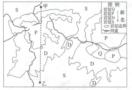 【解析】据图可知,甲乙附近岩层较老,而P处岩层较新,同时P处地势较高,应为山地。由此可知甲乙沿线应为向斜山,向斜山中央凸起,但是岩层应向下弯曲。