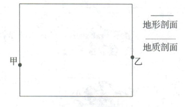 在下图中绘制甲乙沿线的地形、地质剖面图。(4 分)