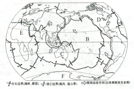 (1)①A为亚欧板块,B为太平洋板块,C为印度洋板块,D为美洲板块,E为非洲板块,F为南极洲板块。