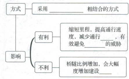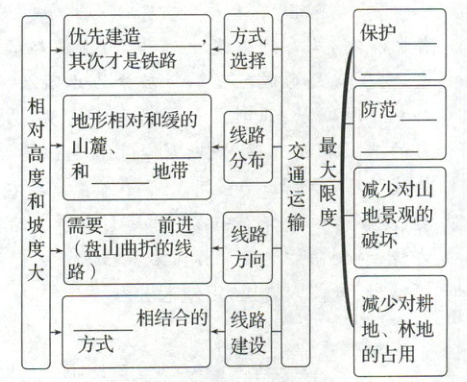 (2)①坡度 高 较大 稳定性 设施②公路 山间盆地 河谷 迂回 桥隧 生态环境 自然灾害③桥(梁)隧(道) 时间 自然灾害 费用