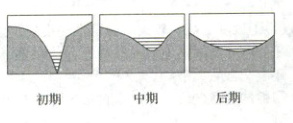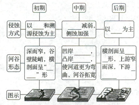 图技巧:初期河谷呈"V"形,中期河谷展宽,后期呈槽形。