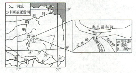 南美洲的卡西基亚雷河(以下简称“卡河”)是奥里诺科河(以下简称“奥河”)上游的一条汊河,经内格罗河流入亚马孙河(如图)。奥河在分汊口附近堆积有大量沉积物。自分汊口向下游方向,相比较而言,奥河河道宽而浅,卡河河道窄而深,卡河河床纵剖面坡度明显大于奥河。目前该分汊口上游约四分之一的来水流入到卡河,专家预测卡河未来将成为主要河道。