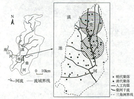 左图为滇池流域示意图。海口河为滇池湖水的惟一出口,元代以来多次疏浚。明代,滇池南岸有大量移民迁入,水稻种植面积逐渐增加。清代,人们在柴河下游相继开挖了十余条沟渠。明清时期,柴河三角洲面积显著扩大。右图示意明清时期柴河三角洲的聚落分布。