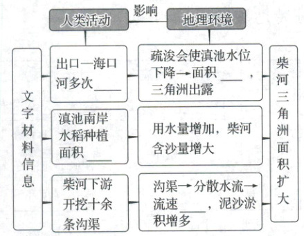 多次疏浚海口河道,使滇池水量减少,水位下降,柴河河口浅滩出露,三角洲面积扩大;(2分)人口数量增加,水稻种植面积增大,河流含沙量增大,为三角洲提供更多沙源;(2分)柴河下游开挖多条沟渠,流速变缓,沉积作用增强。(2分)