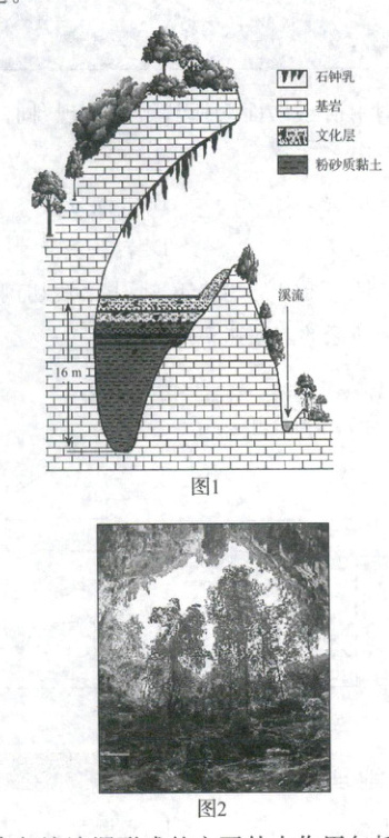(2024·广东选择考)发育于云南省临沧市某处半山腰的硝洞是一个石灰岩溶洞,洞内有较厚的夹杂石灰岩砾石块的粉砂质黏土沉积物,其表层有约 2m 厚的文化层(含有古人类活动遗留物的沉积层)。图 1 为硝洞剖面示意图;图 2 为自洞内望向洞口方向的景观照片。据此完成(1)(2)题。