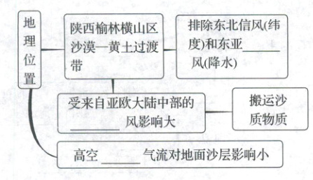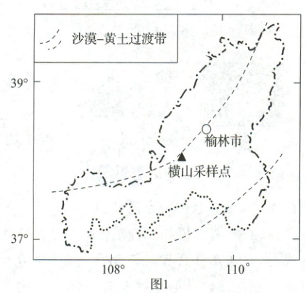 (2024·安徽选择考)地层沉积物的组成及粒径大小在一定程度上可以反映古地理环境的变化。陕西榆林横山区地处沙漠—黄土过渡带(如图1)。图2为横山区某地沉积地层剖面示意。该剖面厚度为17.55m,地层沉积连续,层位清晰。研究发现,该剖面古风成沙层平均粒径较大,沙质黄土层次之,沙质古土壤层最小。据此完成(1)(2)题。