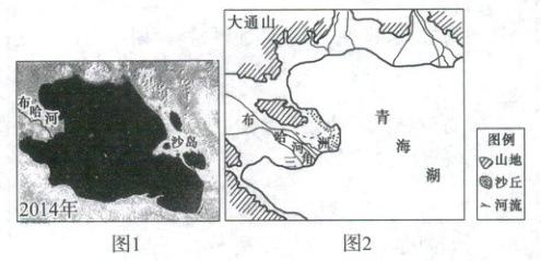 (2024·武汉模拟)青海湖位于我国东部季风区、西北部干旱区和青藏高寒区的交会地带,并具有其自身的湖泊效应,区域内西北风盛行,湖风与陆风交替出现。青海湖周边地区分布有大量沙丘,其中湖区东岸沙岛附近较为集中(见图1,黑色区域为水域),西岸布哈河河口三角洲也有分布(见图2),近年来这些沙丘面积有扩大趋势。据此完成1、2题。