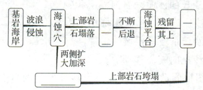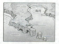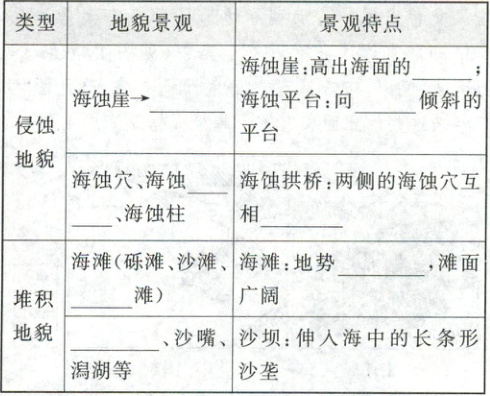 (2)海蚀平台 陡崖 海蚀拱桥 陡崖 海 联通 泥 沙坝 平坦