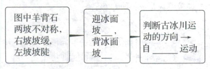 (2023·海南等级考)冰川作用是塑造地表形态的一种重要外力作用,常形成不同类型的冰川地貌。科研人员通过对典型冰川地貌的研究,可判断冰川的规模、运动方向及古气候环境。图中的羊背石是典型的冰川侵蚀地貌景观,由于冰川侵蚀作用方式不同,迎冰面和背冰面坡度不同。据此完成(1)(2)题。