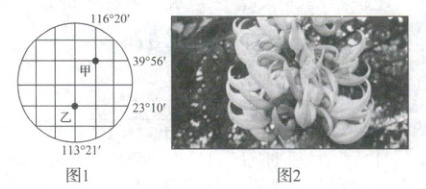 (2025·重庆模拟)国家植物园体系将统筹发挥迁地保护、科学研究等多种功能作用,计划收集全球不同地理分区的代表植物及珍稀濒危植物,为遏制野生植物多样性丧失提供有力支撑。目前,我国已建立北京和华南两个国家植物园,在这两个国家植物园中收集的植物功能性状(指响应生存环境的变化并对生态系统功能有一定影响的植物性状)存在明显差异。图 1 示意这两个国家植物园的经纬度,图 2 为保存在华南植物园温室群园区的植物——翡翠葛。据此完成 1、2 题。
