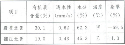 (2025·杭州模拟)专家选取我国华北某两块邻近耕地,对两种秸秆还田方式进行了对比研究。3年后与实验前相比,10~15cm深度土壤的各项平均指标变化如下表所示,其中正值为增加。秸秆翻压深度为15~20cm,有机质腐殖化过程中会产生热量。完成4、5题。