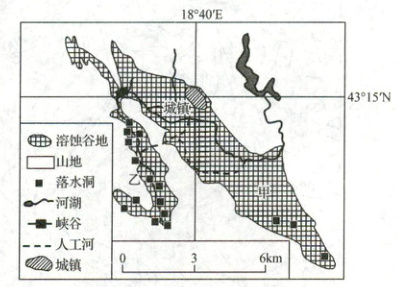 南欧巴尔干半岛的某喀斯特地区年降水量超过1700毫米,地下河发育。包括甲、乙两个溶蚀谷地,暴雨期间,甲谷地排水不畅,易发洪灾。拟建人工河缓解洪灾。下图是该喀斯特地区示意图。