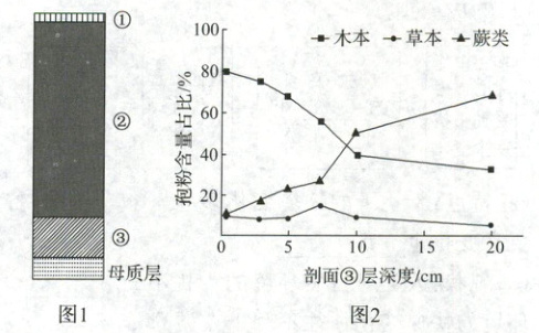 (2024·淮南模拟)图 1 为我国长白山南坡海拔 2050m 处苔原带的某样地剖面。研究发现,该剖面包含火山爆发前土壤层、火山爆发后土壤层、火山灰层和母质层。图 2 为该剖面③层中的孢粉组成。孢粉是植物孢子和花粉的总称,通常用地层中的孢粉作为识别过去植被的证据。据此完成 1~3 题。