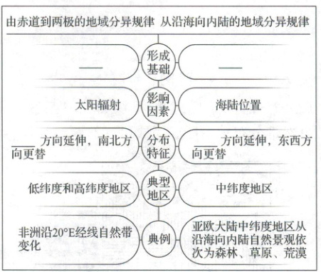 2.热带雨林气候—热带雨林带;热带草原气候—热带草原带;热带沙漠气候—热带荒漠带;地中海气候—亚热带常绿硬叶林带 [回归教材]
