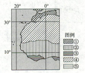 (2024·海口模拟)下图为世界某区域典型植被分布示意图,①②③④⑤代表五种不同的植被类型。据此完成 1~3 题。