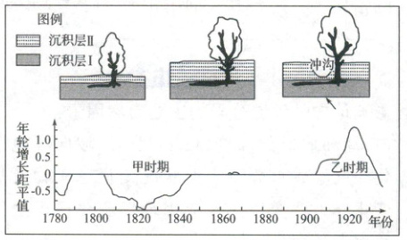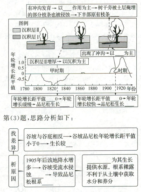 (2024·湖南选择考)美国西南部某河源的小型谷地,气候较干旱。该地品尼松生长缓慢,分枝点低,雨水下渗为其生长提供水源,外力作用会影响其生长状态。1905 年后该地降水增多。下图示意谷底的品尼松生长演变过程,以及相应的年轮增长距平值。据此完成(1)~(3)题。