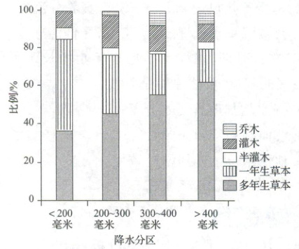 (2024·佛山模拟)浑善达克沙地位于内蒙古高原中东部,其东部以固定、半固定沙丘为主,西部以半固定、流动沙丘为主,从东到西依次分布着疏林草原、典型草原和荒漠草原。下图示意浑善达克沙地 2018~2020 年夏季不同降水分区中不同植被类型占比。据此完成 4~6 题。