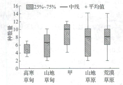 (2025·保定模拟)新疆阿勒泰地区植被类型具有明显的垂直分布特征。某研究人员对海拔600m以上不同高度的植被种类进行物种丰富度调查,绘制了不同自然带的植物种类数量特征箱线图(下图)。据此完成4、5题。