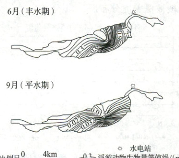 比例尺0 4km 水电站 0.3浮游动物生物量等值线$/(mg·L⁻^1)$