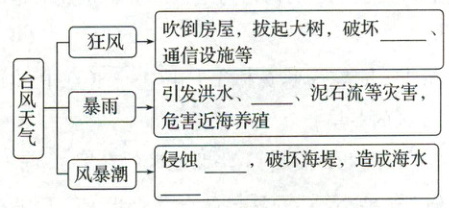 台风天气 --> 风暴潮 --> 侵蚀___,破坏海堤,造成海水___