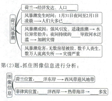 第(1)题,理清思路→风暴潮强度大、发生时间特殊、造成危害大(人员伤亡多、财产损失大),具体如下: