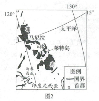 材料二 菲律宾(图2)每年都要遭遇大约20次台风,莱特岛是菲律宾遭受台风和地质灾害的重灾区之一。长期以来,莱特岛居民在附近的山上乱砍滥伐。2006年2月,当地连续两周暴雨,发生了大规模的泥石流,导致数百人丧生,千余人失踪。