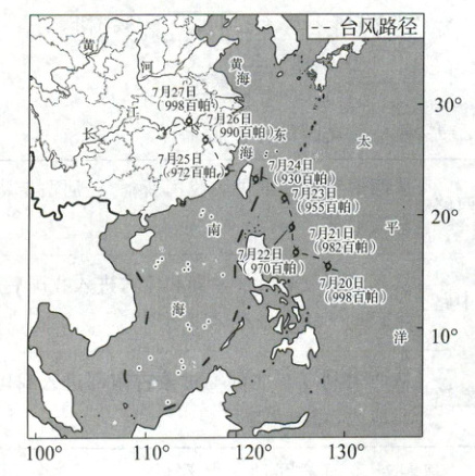 (2025·丰台模拟)下图为北京时间2024年7月20日—27日每日20时台风“格美”中心所在位置及气压数值。读图,完成1、2题。