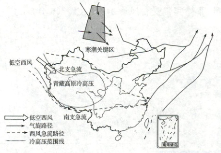 (2024·岳阳模拟)冬季,青藏高原阻挡低空西风急流,使之分为南、北两支急流,北支急流经我国西北、华北、东北和华东等地区流向太平洋;南支急流流过青藏高原南侧后转变成温度较高、湿度较大的西南气流,影响四川、贵州、云南、华南及长江中下游地区。每年冬季,来自寒潮关键区的寒潮造成我国大范围地区降温。读图,完成3、4题。