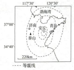 (2025·漳州模拟)据《竹书纪年》记载,夏帝发七年(公元前1831年),当名为“发”的皇帝正在登泰山时,发生了一次强地震,该次地震被命名为“泰山震”。有学者重新考察已发现的地震地质遗迹,结合一系列的测试、实验与剖析,认为“泰山震”震中处在泰山以东约200km的安丘地区。下图为“泰山震”等震线模拟图。完成1、2题。