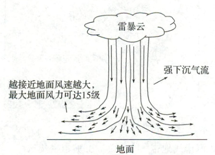 下击暴流常常伴随有强辐散风,越接近地面风速越大,且有低空风切变(提示:飞机起降时需要平稳的气流环境),易导致飞机颠簸,影响飞机飞行姿态,飞机起降安全威胁最大。