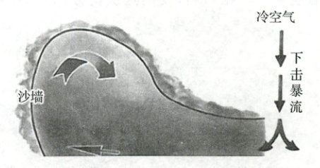 雷暴发展时,会在云层中形成上升的暖空气流和下降的冷空气流,当冷空气快速下沉并接触地面时会沿地面向外扩散,形成水平尺度只有几千米的下击暴流。在干旱半干旱地区,这种下击暴流可以冲击地面的沙尘,使它们进入空中,形成一道高大而浓密的沙墙。下图为下击暴流及沙墙形成示意图。完成 1~3 题。