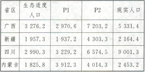 (2024·孝感模拟)生态适度人口是指从维护生态系统稳定和保证自然资源可持续利用角度来考虑区域的适度人口规模。下表为广西、新疆、四川、内蒙古四省区生态适度人口数据(单位:万人)。据此完成 3、4 题。