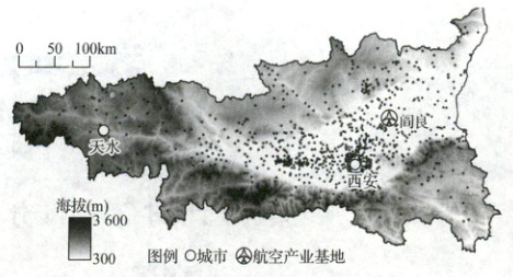 (2024·浙江 1 月选考)西安是关中—天水经济区中心城市,拥有国家级航空产业基地,该基地位于阎良。阎良航空产业起步于 20 世纪 50 年代末,现已发展成集研发、制造和试飞于一体的“航空城”。下图为关中—天水经济区人口点密度示意图。完成 1、2 题。