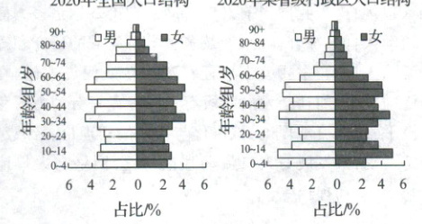 (2024·邯郸模拟)下图示意2020年我国全国和某省级行政区的人口结构特征,完成1、2题。