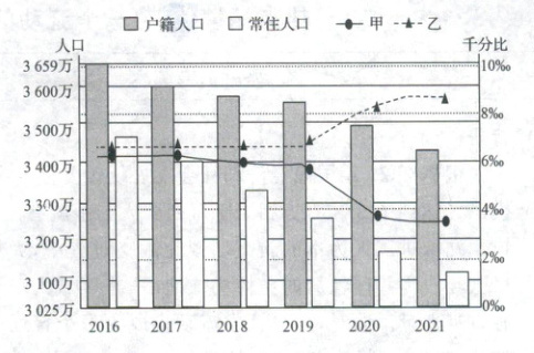(2024·浙江联考)常住人口是指在某地实际居住半年以上的人口,包括户籍人口和外来常住人口,下图柱状表示黑龙江省2016年—2021年户籍人口和常住人口的数量变化,曲线表示出生率和死亡率的变化。完成3、4题。