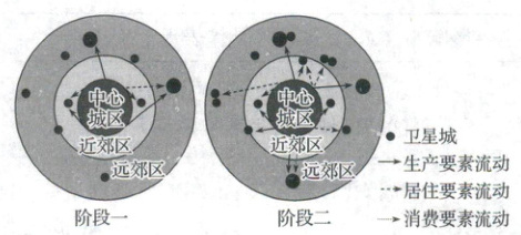 城镇化促使居住、产业等诸多要素向郊区迁移。传统郊区化主要集中于中心城区的近郊区,而后郊区化则更倾向于远郊区。上海已经进入后郊区化时代,远郊功能空间更加复杂多元。下图示意上海市后郊区化空间发育模式演变。据此完成1、2题。