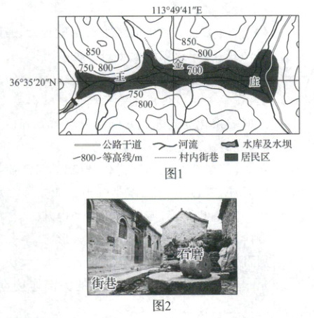 (2025·沧州模拟) 王金庄村位于河北省涉县,是一个坐落在太行山深处的山村,村内街巷阡陌,是中国传统村落名村,河北第二批历史文化名村。据考证,王金庄村始建于元末明初,如今,村内仍保留有许多古时的石房、石街、石巷、石桌、石凳、石碾、石磨、大树等,古石磨多沿街巷露天而建。图 1 为王金庄地形分布图,图 2 为沿街巷露天石磨景观图。据此完成 1、2 题。
