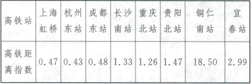 展。高铁距离指数是指高铁站到城市中心的距离与设站后城市建成区面积之比,距离指数较大,表明高铁站远离城市中心,距离指数在 0.93~2.14 的高铁枢纽产生的城市空间扩展效应最明显。下表示意某地理兴趣小组调查的我国部分地区高铁距离指数。任务 1 与贵阳北站相比,分析杭州东站到市中心距离的特点。