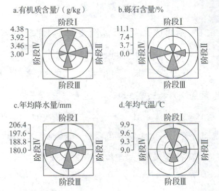 (2024·广东选择考)1984年以来,贺兰山东麓地区葡萄酒产业发展经历了萌发停滞(Ⅰ)、缓慢发展(Ⅱ)、快速发展(Ⅲ)和高速发展(Ⅳ)4个阶段,葡萄种植面积持续增加,葡萄酒生产集群规模不断扩大且重心向东南方向移动。下图反映4个阶段葡萄种植区自然要素变化。据此完成4、5题。