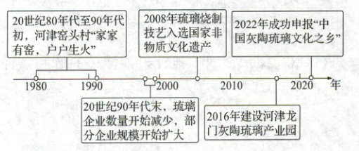 (2024·安徽选择考)河津市地处黄河与汾河交汇处,是灰陶琉璃的故乡。河津灰陶琉璃历史悠久,题材多样。如图为20世纪80年代以来河津灰陶琉璃产业发展历程。据此完成(1)~(3)题。