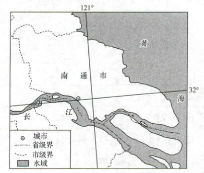 蓝印花布是以蓝草中提取的靛蓝为染料,采用全棉面料通过多道印染工艺制作的手工印花织物,曾在我国民间广泛流行。江苏省南通市地处长江三角洲,被称为“中国蓝印花布之乡”。该地历史上纺织手工业发达,明清时期棉花和蓝草种植广泛,曾经“乡乡都有染布坊,村村都有染布匠”。目前,南通仍有少量传统蓝印花布生产,成为传统土布生产的“活化石”。2006年,南通蓝印花布印染技艺被列入我国首批非物质文化遗产保护名录。下图为南通市地理位置示意图。