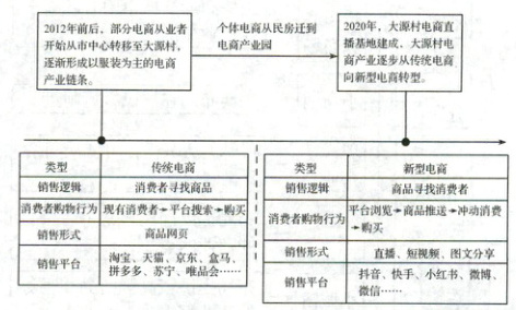 大源村是广州郊区的一个城中村,邻近服装批发市场。2018 年以来,大源村逐步把旧厂房改造为电商产业园,同时成立了大源电子商务协会,并构建了“政—校—企”三方合作平台。下图为大源村由传统电商向新型电商转型示意图。完成 1~3 题。