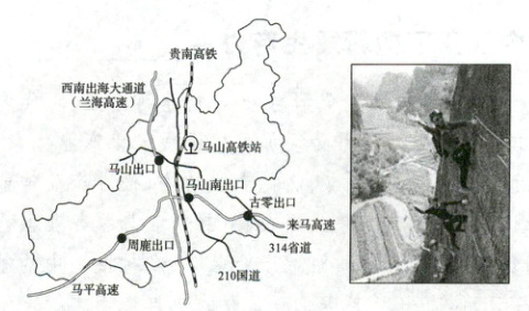 马山县通过推广攀岩特色体育小镇产业融合发展模式,开展攀岩、夏令营、骑行、山地马拉松、壮族民歌、研学旅行等活动,立足马山生态、文化和山地资源优势,不断深化“体育+”“文旅+”模式。全县每年乡村旅游接待人数占全县旅游接待总人数的 60%以上,特色小镇在助力脱贫增收方面发挥的作用日益凸显。下图为马山县部分交通网络图和攀岩景观图。