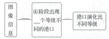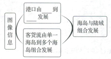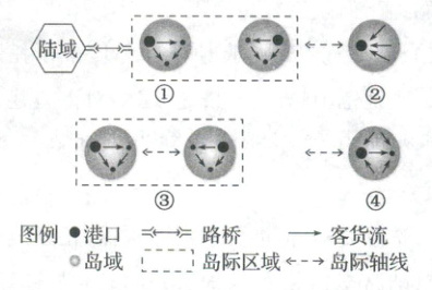 (2023·湖南选择考)港口地域组合是指一定地域范围内的诸多港口长期相互作用,形成具有某种分布格局、结构形式和功能类型的组合。下图示意海岛港口地域组合演变的不同阶段。据此完成(1)(2)题。