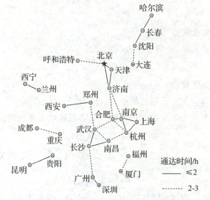 交通网络构筑了城市关联骨架,发达的交通网络能够深刻影响城市空间联系并重塑区域空间格局。下图示意 2021 年我国中心城市间高铁 3 小时以内通达时间格局。据此回答 1~3 题。