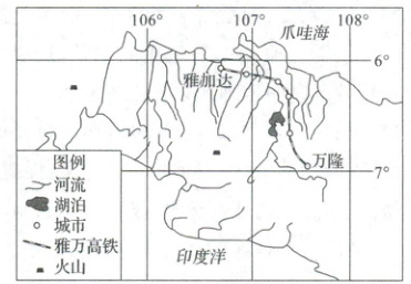 雅万高速铁路是一条连接印度尼西亚雅加达和万隆的高速铁路,是东南亚首条高速铁路,是“一带一路”倡议的标志性工程和印度尼西亚国家战略项目,也是中国高铁全系统、全要素、全生产链走出国门的“第一单”。雅万高铁全长 142.3 千米,最高运营时速 350 千米。依托复兴号中国标准动车组先进成熟的技术,我国修建时主动适应印度尼西亚当地运行环境和线路条件,融合印度尼西亚本土文化,使雅万高速铁路形成了技术先进、安全智能、环境适应力强、本土特色鲜明等特点。下图为雅万铁路及周边区域图。