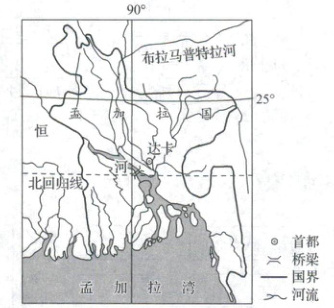 孟加拉国河网密布,帕德玛河是主要河流之一。帕德玛河河面宽阔,河水湍急,自西向东将孟加拉国中西部地区分为南北两部分,居民往返两岸必须依赖轮渡。距离孟加拉国首都达卡西南约 50 千米处,由中企承建的帕德玛大桥横跨帕德玛河之上,全长 9.8 千米,上层为双向四车道公路,下层是单线铁路。该大桥的建成通车,结束了该国南部 21 个区和首都之间摆渡往来的历史。下图示意帕德玛大桥位置。