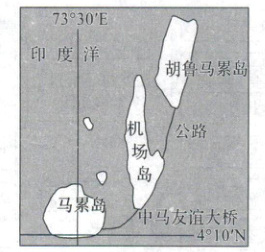 中国援建马尔代夫的中马友谊大桥于 2018 年 8 月 30 日正式开通。下图为马尔代夫局部地区示意图,图中马累岛为主要居住岛,面积不足 1.8 平方千米,居住人口 20 多万。新建的中马友谊大桥连接起了马累岛、机场岛和胡鲁马累岛。据此完成 1、2 题。