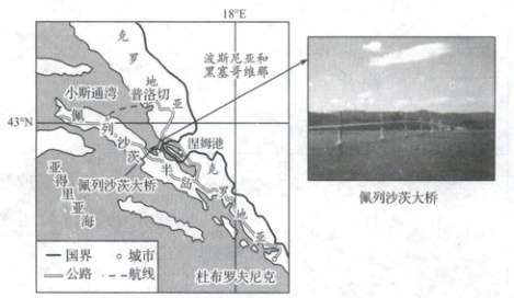 (2024·临沂模拟)杜布罗夫尼克被称为“亚得里亚海滨明珠”,是欧洲重要旅游城市。由于历史和地理原因,与克罗地亚本土被波黑隔开,当地居民往返两地要穿越其他国家。2022 年 7 月 26 日,由中企承建的佩列沙茨大桥正式通车,结束了该国领土长期隔离状态。大桥跨越亚得里亚小斯通湾,总长 2440m,桥面两侧设有 C 字形挡风板,桥体共 14 个墩台,其中 10 个墩台布置在平均深度为 27m 的海中,7~8 号桥墩主跨设置尺寸为 200m×55m。下图示意佩列沙茨大桥位置。据此完成 3~5 题。