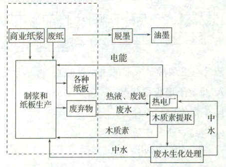 1.图中的产出环节较多,产出的产品多样。工业产出主要包括产品与废弃物,在循环经济流程中废弃物被循环利用,最终产出应该是为生产生活服务的产品,其不再继续参与下一个循环流程,从图中可以看出油墨和各种纸板属于最终消费品,B正确;废弃物、木质素、中水均属于该循环经济流程中的中间环节,不属于最终产出,A、C、D错误。2.与原生流程相比,该循环经济流程并未提供生产能提供新的原料,A错误;循环经济为某一纸板产能,但是发电用水也是循环经济为其提供的,与能源相比,节约的水资源更多,B错误,C正确;油墨属于产品,并非投入的生产资料,D错误。